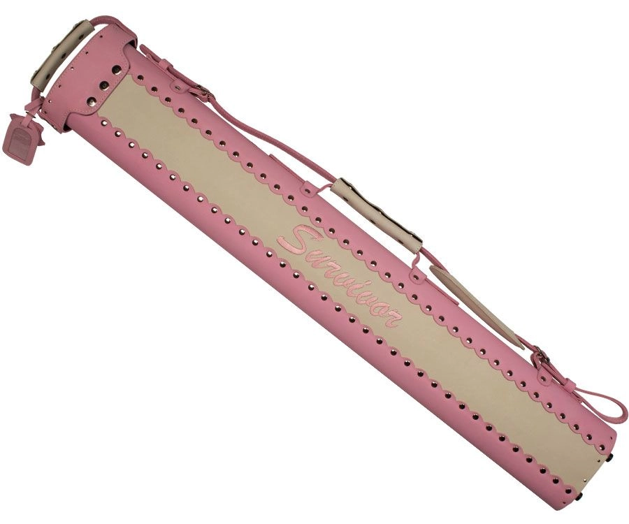 This case is made from sueded pink and cream leather and has hard molded, felt lined tubes to safely house up to two butts and four shafts. The accessory pockets have convenient zipper enclosures, and the stainless steel latch at the top of your case holds the lid securely in place.Â