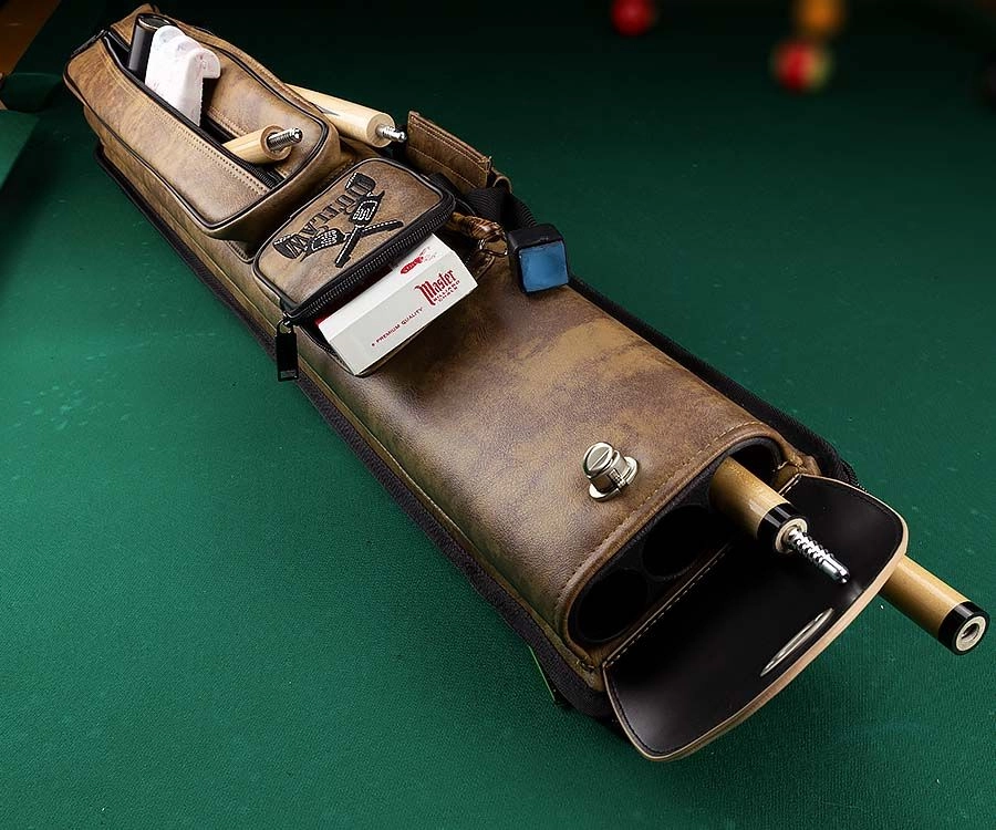 Classic dusty brown color? Check. Cool stitched horseshoe design? Check. Ability to transport 3 butts and 5 shafts? Check. This Outlaw case can do all of that and more! Got a jump handle and don’t want to carry it in your pocket? Well this case has a longer zippered pocket just perfect for it as well as a smaller pocket perfect for your chalk or other smaller items that can get lost in the shuffle. A sturdy base at the bottom with a couple of plastic feet is so very important as you don’t have to worry about the bottom getting all dirty from resting on the pool hall floors. With poured rubber mold castings to keep your cues safe, this is certainly a case to look into.Â